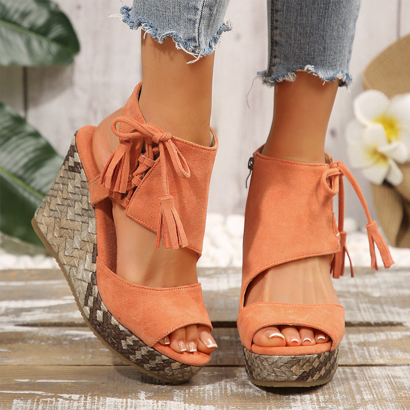 Damen-Sandalen mit offener Zehenpartie und Plateau-Keilabsatz und Quaste