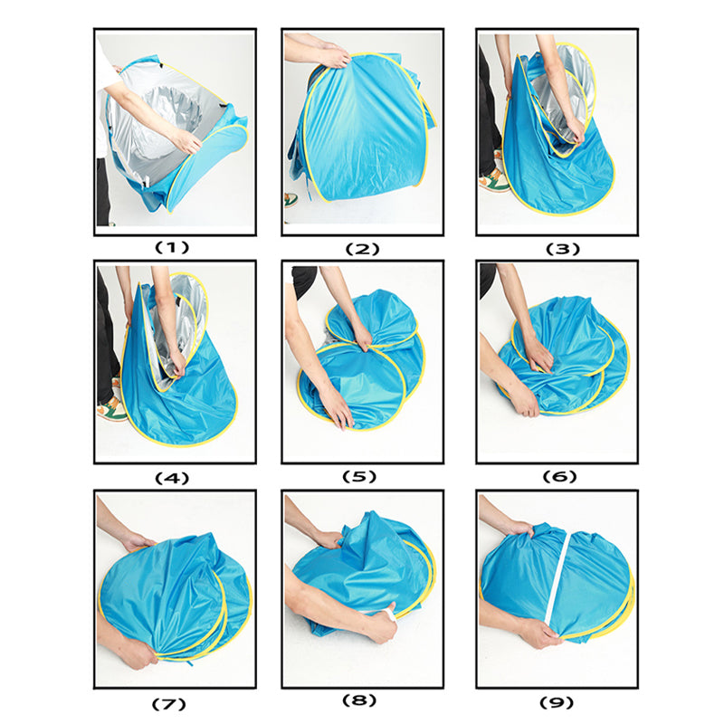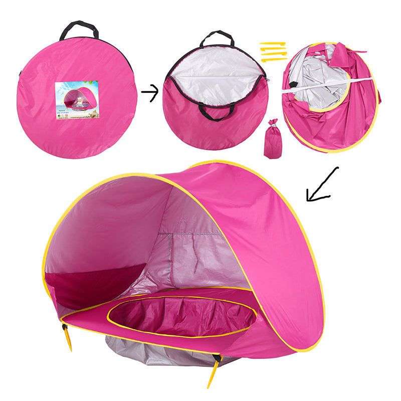 Das hübsche Zelt lässt sich innerhalb von 2 Sekunden aus der Tragetasche herausnehmen und ganz einfach wieder zusammenfalten. Die Stützstange ist sehr flexibel. Sie besteht aus elastischem Material und hält daher jahrelang vielen Biegungen stand!