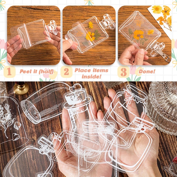 Diese Lesezeichen-Packung gibt es in verschiedenen, ästhetisch anmutenden transparenten Flaschen, die mit bunten Trockenblumen gestaltet werden können. So können Sie Ihrer Kreativität freien Lauf lassen und Ihre Liebe zur Natur zum Ausdruck bringen, um Ihr eigenes, einzigartiges, mit Blumen gepresstes Lesezeichen zu erstellen. Bereiten Sie einfach Ihre gesammelten getrockneten Blumen oder Blätter vor, formen Sie sie in das Lesezeichen, drücken Sie die Aufkleberfolie zurück, um sie zu befestigen, und schon sind Sie fertig. Kein kompliziertes Pressen, Laminieren und unordentliches Schneiden oder Kleben mehr erforderlich. Das perfekte Lesezeichen, um das Lesen von Büchern noch angenehmer zu machen und Ihren Seiten einen Hauch von Natur zu verleihen!