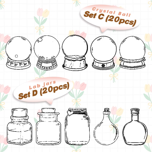 - Stil: Set A (klassische Gläser), Set B (Parfums), Set C (Kristallkugeln), Set D (Laborgläser),