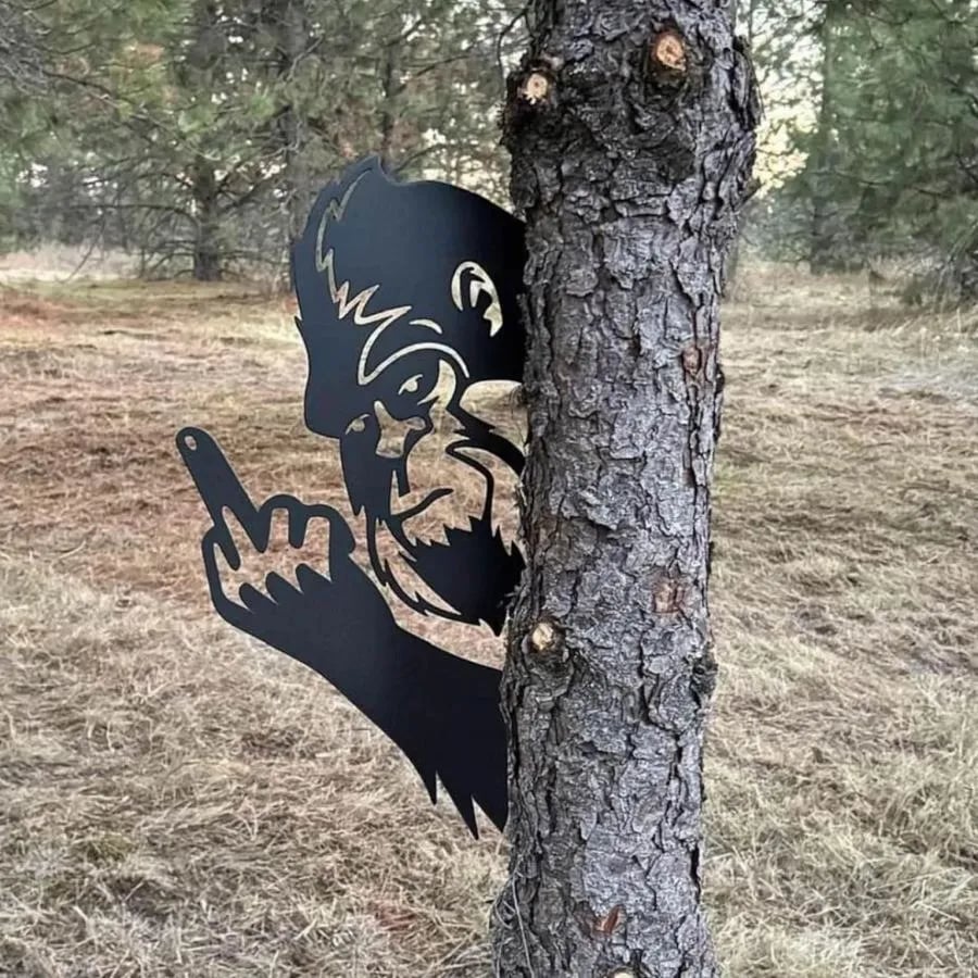 Diese aus strapazierfähigen Materialien gefertigte, skurrile Silhouette zeigt Bigfoot, wie er mit ausgestrecktem Arm und einem erhobenen Finger in klassisch rebellischer Manier um einen Baum oder Pfosten schleicht.