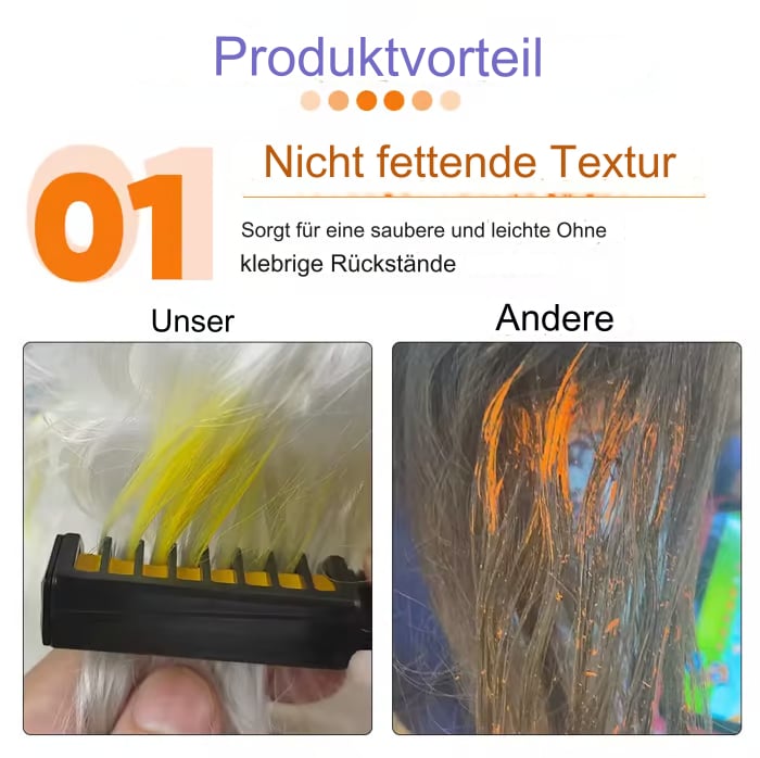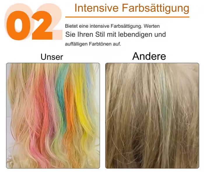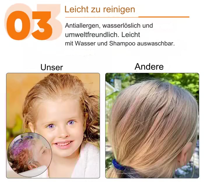 🌳【Leicht zu reinigen】Die Haarkreide ist antiallergen, wasserlöslich und umweltfreundlich und hält bis zu 3 Tage. Waschen Sie Ihr Haar einfach wie gewohnt mit Wasser und Shampoo, um die Farbe zu entfernen.