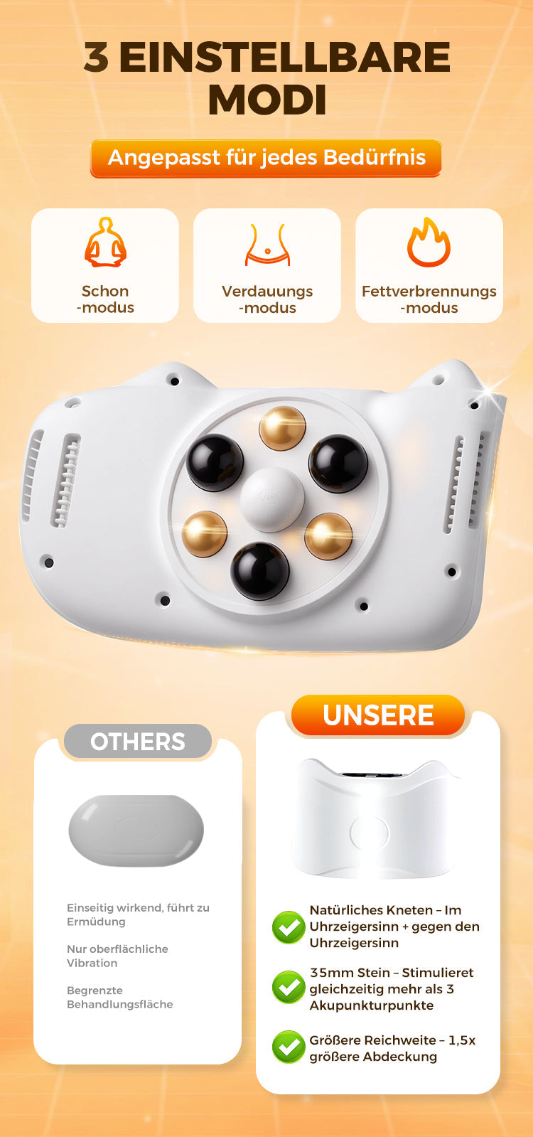EINSTELLBARE INTENSITÄTSSTUFEN: Mit drei einstellbaren Intensitätsstufen können Sie die Massage nach Ihrem Komfort anpassen. Finden Sie die perfekte Einstellung für Ihre Bedürfnisse und genießen Sie ein entspannendes, effektives Massageerlebnis.