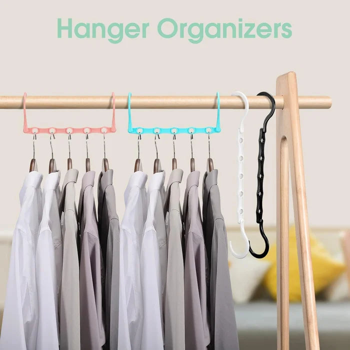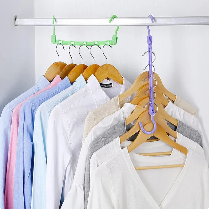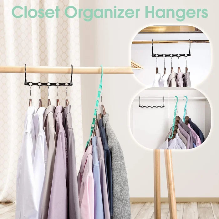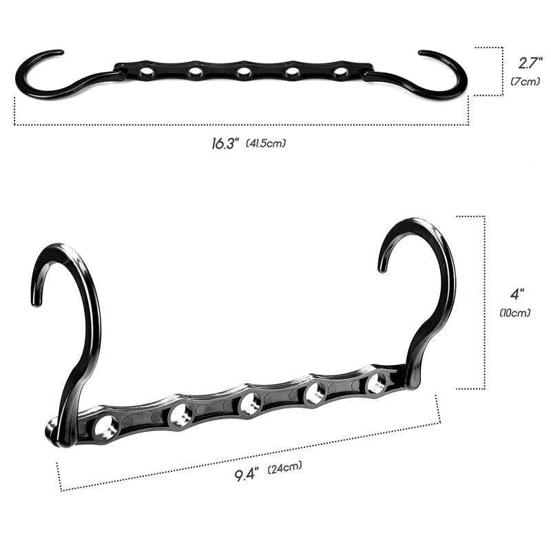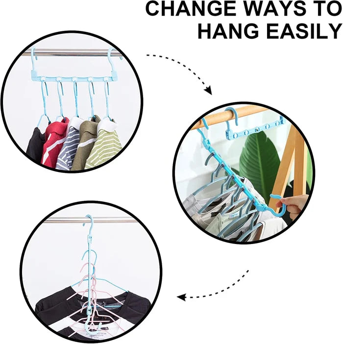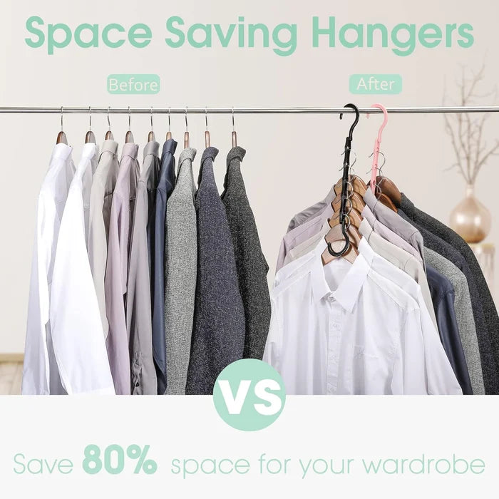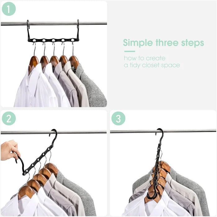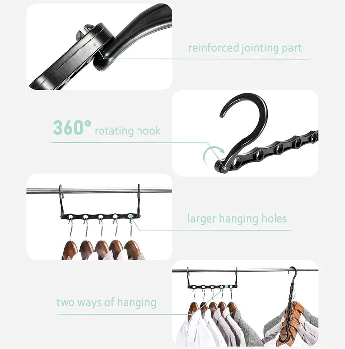 🔄 Innovatives Design: Unsere magischen Kleiderbügel verfügen über 5 strategisch platzierte Löcher, um ein Verrutschen und Herunterfallen der Kleidung zu verhindern. Die um 360 Grad drehbaren Haken sind breit genug, um an eine Vielzahl von Kleiderstangen zu passen, was sie unglaublich vielseitig und einfach zu verwenden macht.